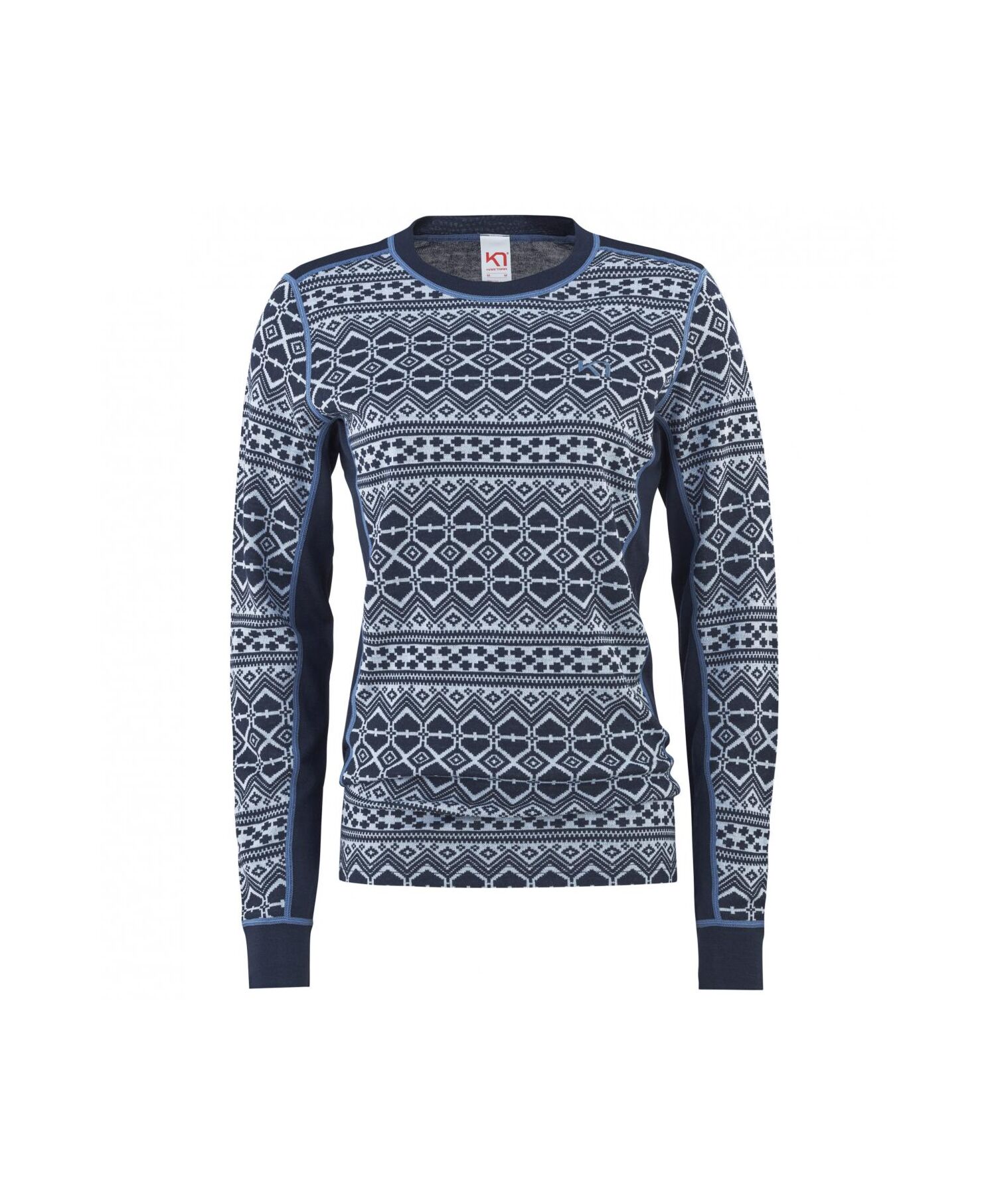 Kari Traa Hjerte Langermet Ulltrøye er et basislag i ullblanding til kvinner. med et sporty. jacquardstikket mønster. Ull og tekniske fibre er kombinert for å gi et mykt stoff som er varmt. pustende og naturlig lukthemmende. Vi dobler feelgood-følelsen: Underarmspanelene gjør at du kan kaste armene i været uten at plagget glir opp. mens den effektive Lenzing Modal®-produksjonsmetoden gir deg ren samvittighet.