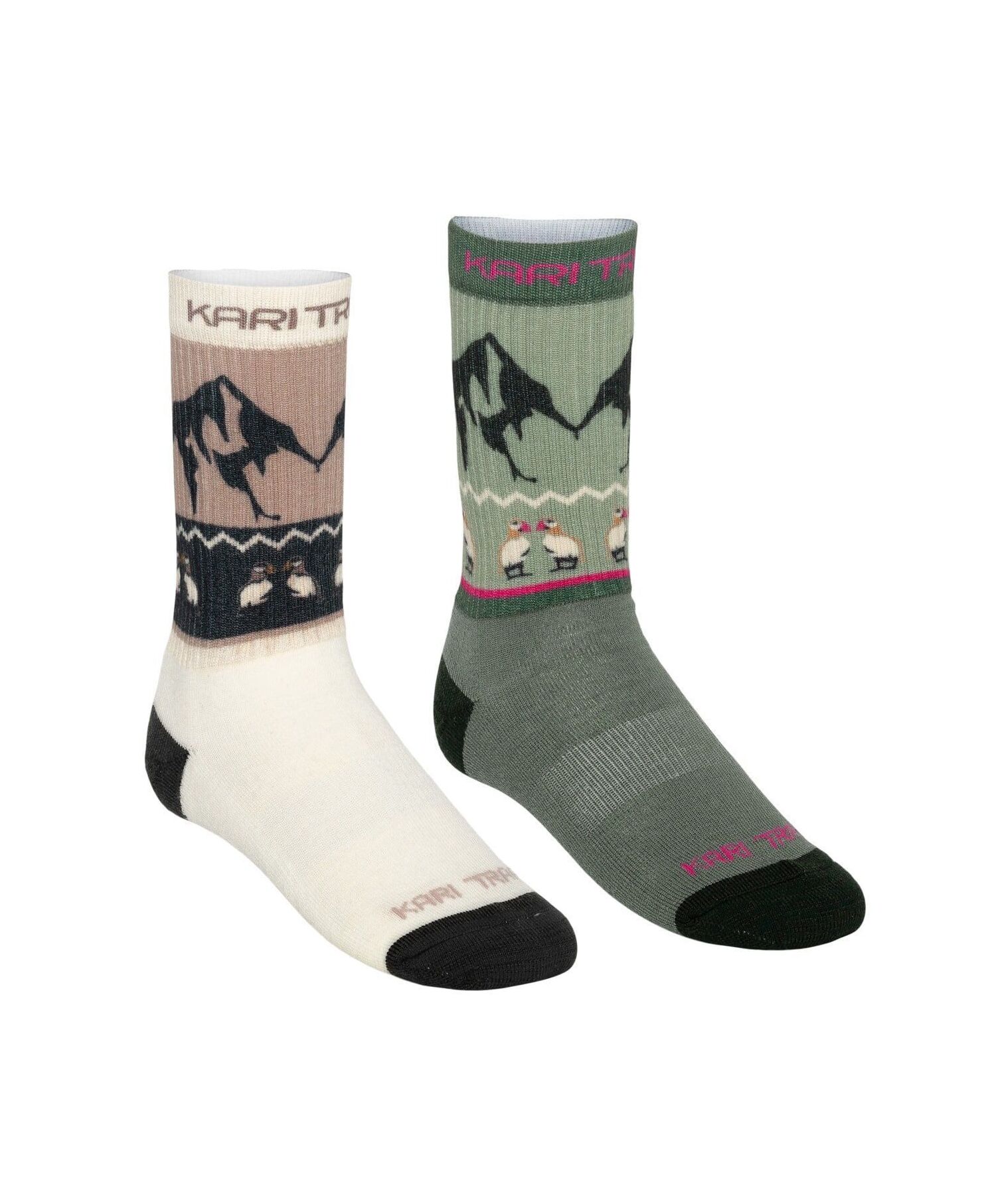 Kari Traa Puffin sokk er en behagelig sokk laget i en blanding av merinoull og polyester med forsterkede hæler og tær. Den sømløse tåen beskytter mot gnaging, og de ribbestrikkede mansjettene gjør at sokken beholder formen sin. Sokkene er dekorert med en "Atlanterhavets pingvin" og fjellandskap, som gjør de lekene og unike.