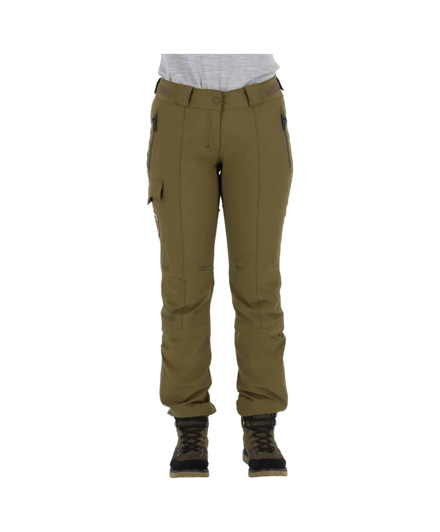 4-veis stretch. Tapede sømmer. Borrelåsjustering i live. Beltehemper. Sidelommer med vannavvisende glidelås. Lårlomme under klaff. Knappejustering og glidelås nederst på ben. Leddede knær. Meshfòr