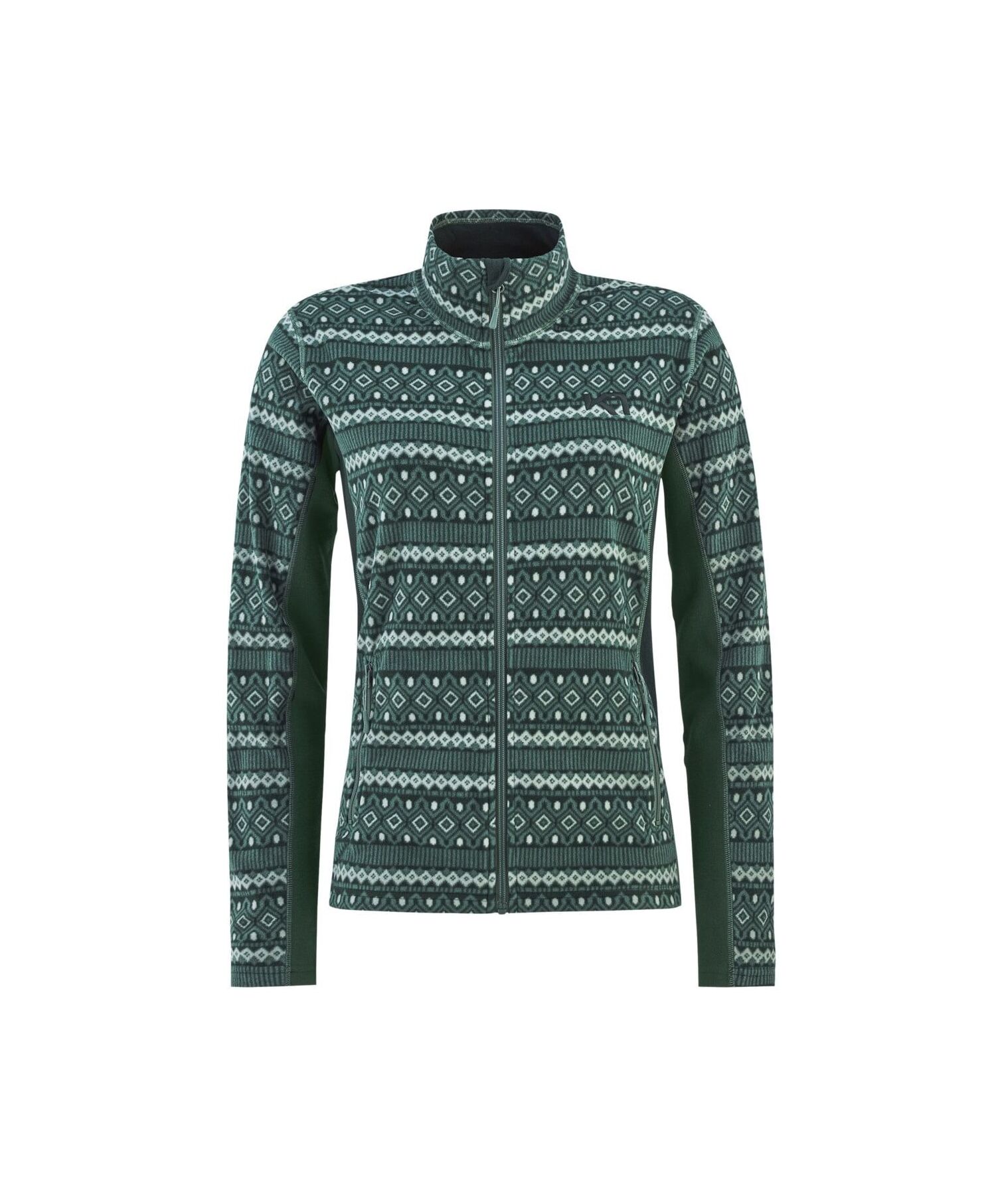 Kari Traa Olga Fleecejakke er en varm, vintermellomlagsjakke med avslappet snitt til kvinner, med et iøynefallende, heldekkende inka-mønsterdesign for å utforske naturen med stil.