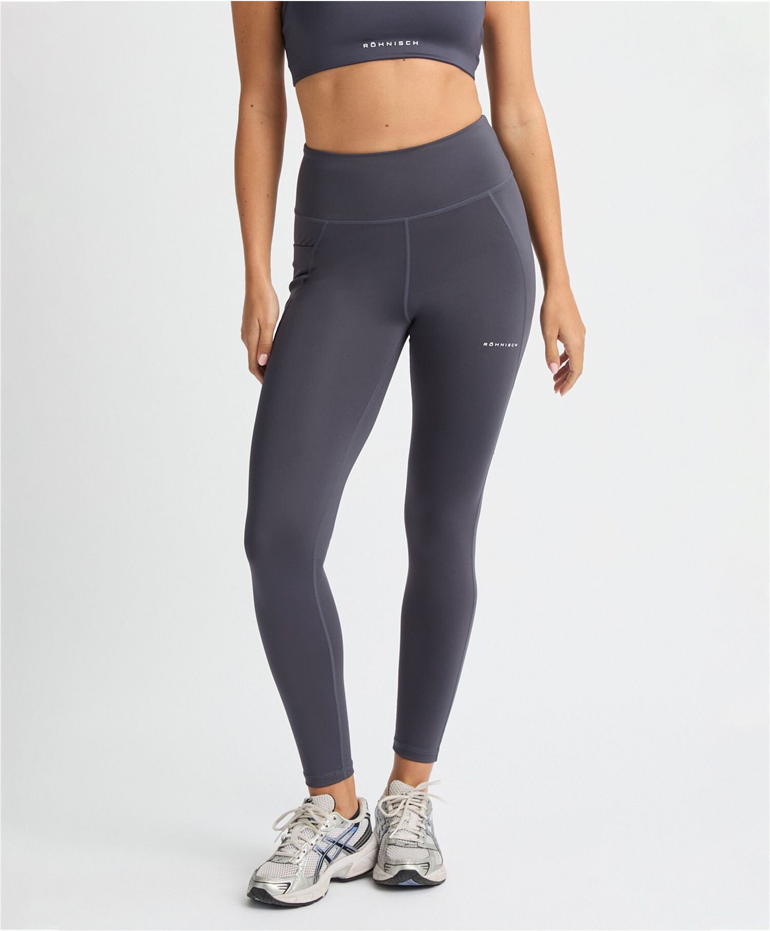 Röhnisch tights med mye stretch. Laget i en blanding av resirkulert polyester og elastan. Utstyrt med et pustende og fukttransporterende stoff som hjelper deg å holde deg kjølig og tørr til enhver tid. Designet med en funksjonell sidelomme på benet, med en ekstra sikkerhetsfold for å holde telefonen på plass, og en justerbar snøring i midjen. Dekorert med en Röhnisch-logotekst på benet. Flattering har høy midje og lange ben med en indre søm på 69 cm. Flattering Tightsen blir også brukt som et komfortabelt alternativ i hverdagsgarderoben.