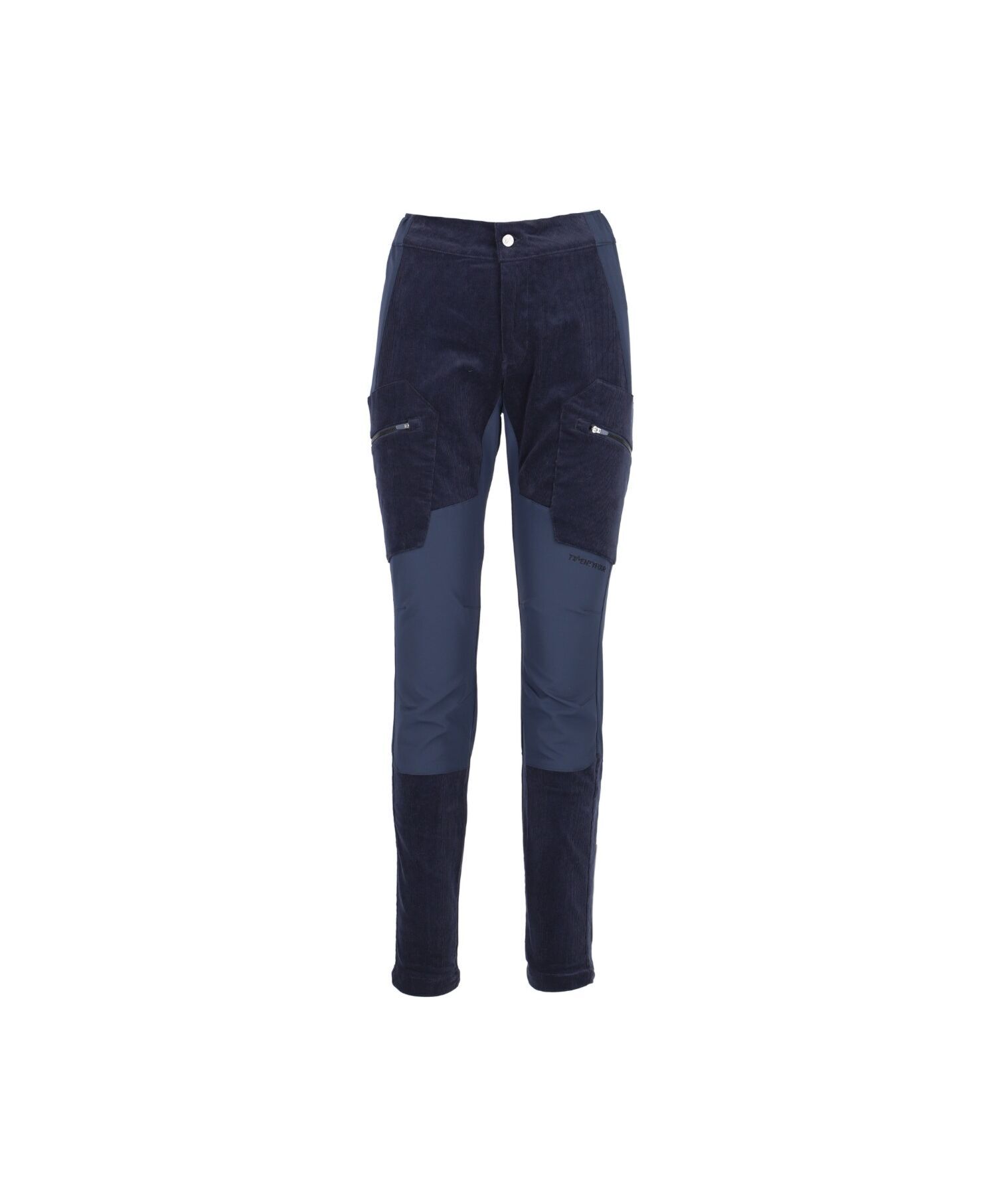 Turbukse i en kombinasjon av myk cord og elastisk softshellmateriale. Lårlommer med glidelås og glidelåsjustering nederst på ben. Smal silhuett med leddede knær og strikk i livet.